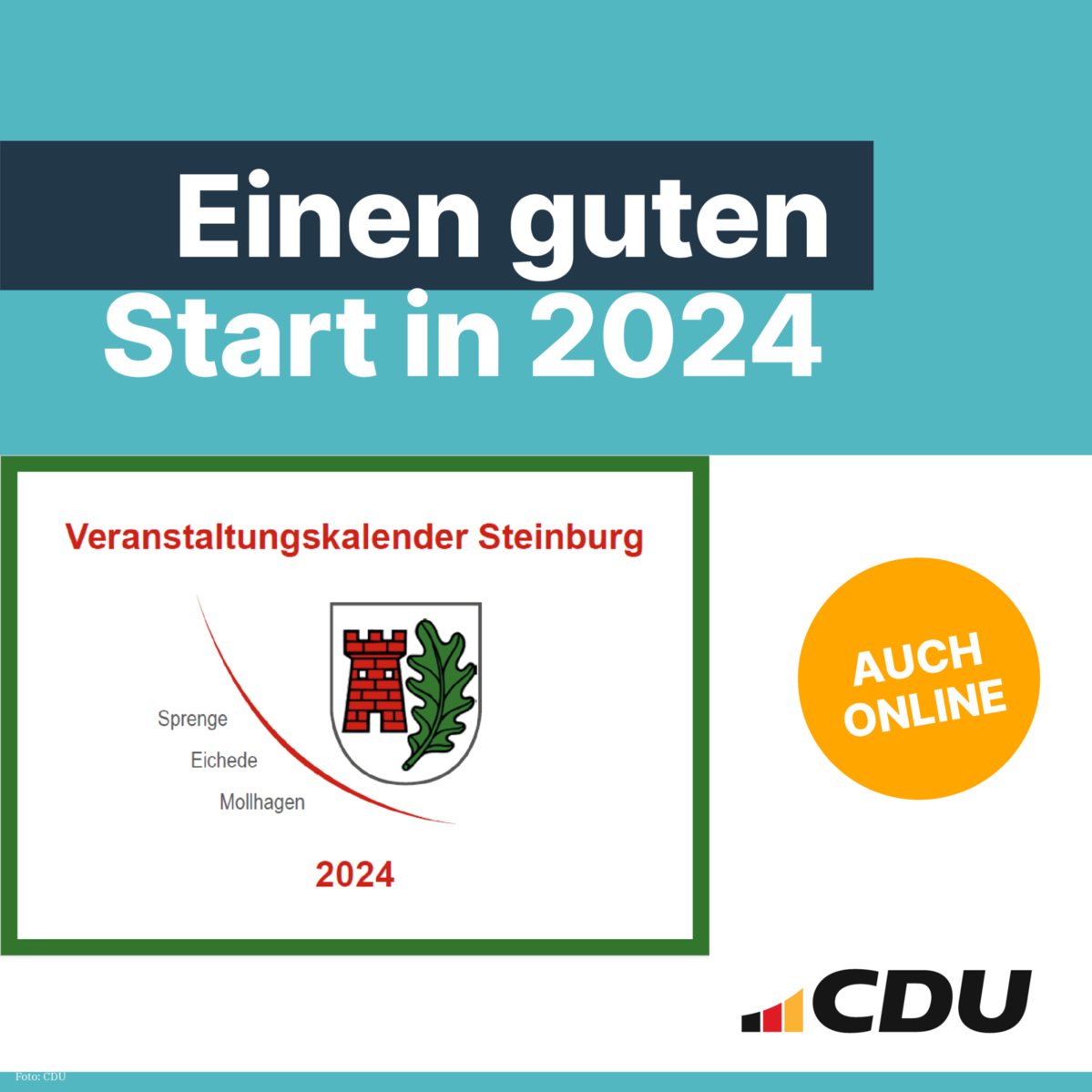 Ein glückliches und gesundes neues Jahr wünscht die CDU in Steinburg. 2024 wird ein spannendes Jahr, mit vielen tollen Veranstaltungen. Damit Sie nichts verpassen, wurde der aktuelle Veranstaltungskalender unserer Gemeinde in der letzten Dezemberwoche in alle Haushalte verteilt. Falls das irgendwo nicht geklappt hat, melden Sie sich gern - es gibt noch ein paar Exemplare.